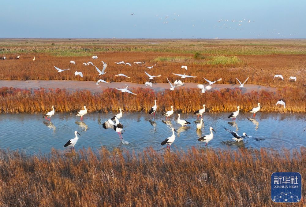 ↑10月21日,东方白鹳、白琵鹭在山东东营黄河口湾区湿地栖息、觅食(无人机照片)。新华社发(周广学 摄)