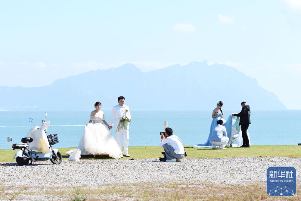 ↑10月14日,市民在山东青岛灵山湾拍摄婚纱照。新华社发(俞方平 摄)