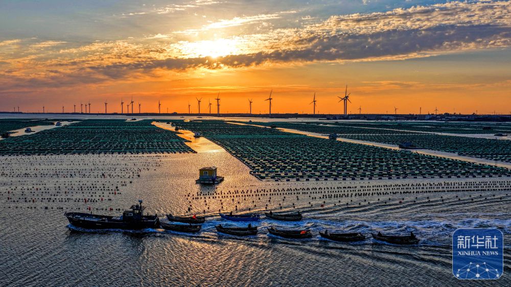 ↑10月23日,在山东威海桑沟湾,渔民驾船出海作业(无人机照片)。新华社发 (李信君 摄)