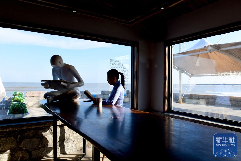 ↑10月22日,市民在位于山东日照张北湾的海洋美学馆城市书房看书。新华社记者 郭绪雷 摄