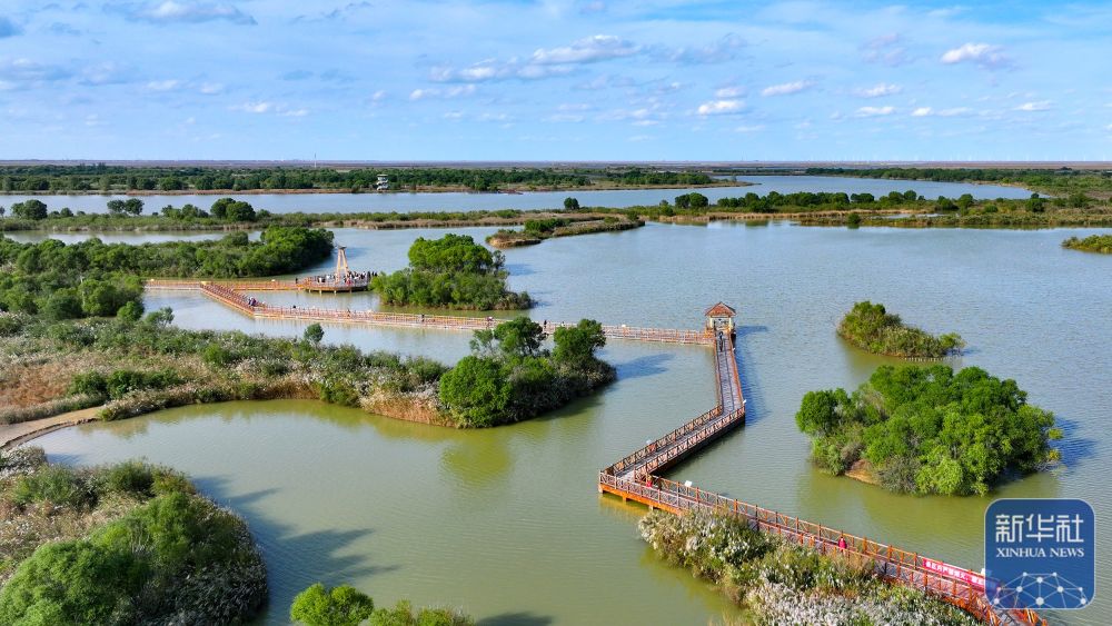 ↑10月20日拍摄的山东东营黄河口湾区湿地景色(无人机照片)。新华社发(周广学 摄)