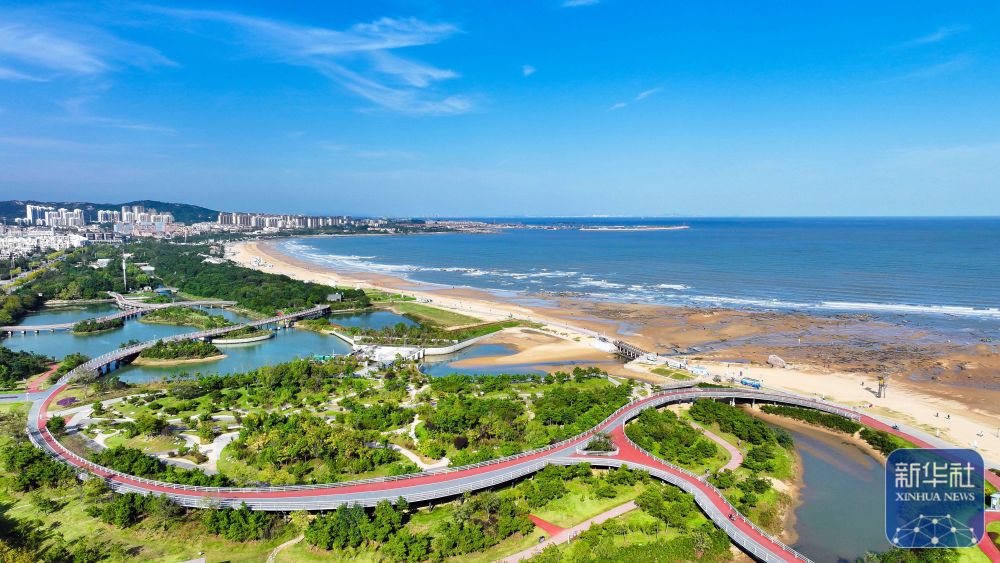 ↑10月22日拍摄的山东日照张北湾阳光海岸绿道及海湾景色(无人机照片)。新华社记者 郭绪雷 摄